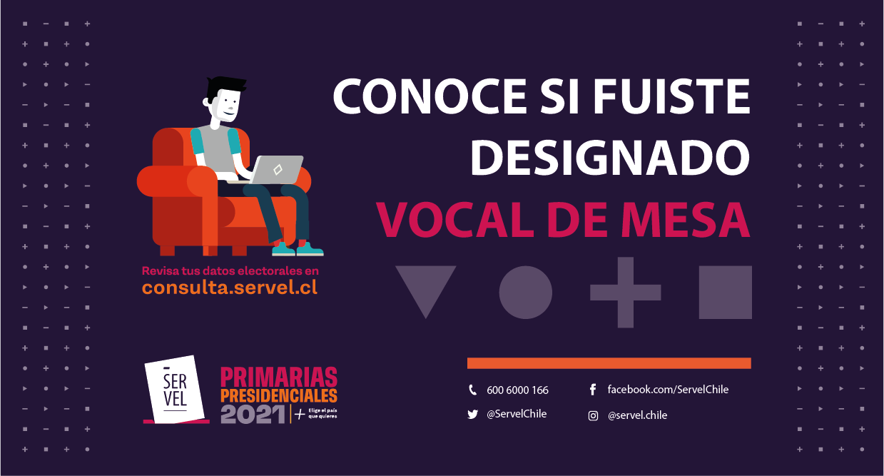 Este sábado el Servicio Electoral Servel publicó la lista de personas que serán vocales de mesa reemplazantes para las primarias presidenciales a realizarse el 18 de julio. Asimismo todo elector puede conocer si fue designado vocal de mesa su local de votación y mesa consultando sus datos electorales en httpsconsultaservelcl. Vocales de Mesa Primarias 2017. Este sábado 30 de octubre podrás conocer si fuiste designado vocal de mesa por las juntas electorales ingresando a consultaservelcl.