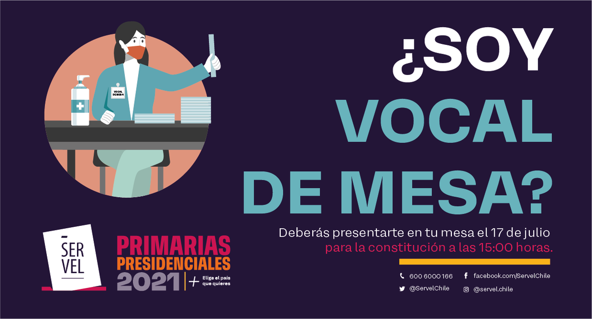 La nómina de vocales de mesa se publicó igualmente en diarios o periódicos. Tanto en la constitución de mesas como en el día de la elección deberás respetar el protocolo sanitario que incluye medidas como la distancia física de un metro con electores y otros vocales el uso permanente de mascarilla y el lavado o desinfección frecuente de manos. Vocal de mesa servel primarias. Servel Vocal De Mesa 2021 Rut Servel Inmobiliaria Servel Home Facebook Servel inicia - Este domingo 18 de julio tanto en chile como en el extranjero se desarrollarán las elecciones primarias presidenciales.